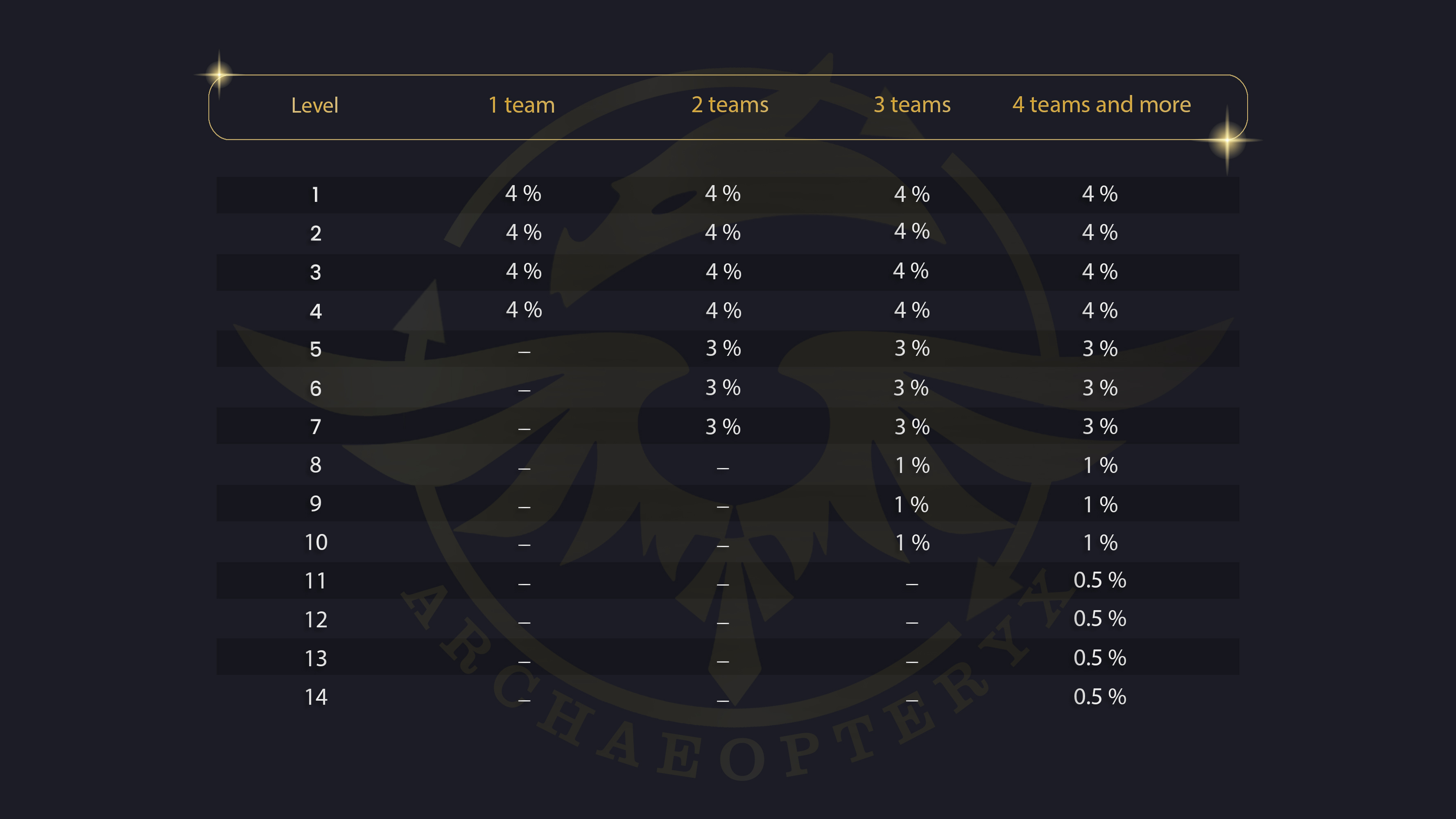 In the first step, if you have developed two teams (branches in referral chart) which each one has invested greater or equal to 1000 USDT, your commission will be 100 USDT.